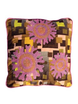 Funda de cojín en pagne de algodón 100% con estampado geométrico en tonos marron, amarillo y blanco, con flores bordadas en rosa, naranja y plata, hilo de lurex. Ribete en algodón rosa.